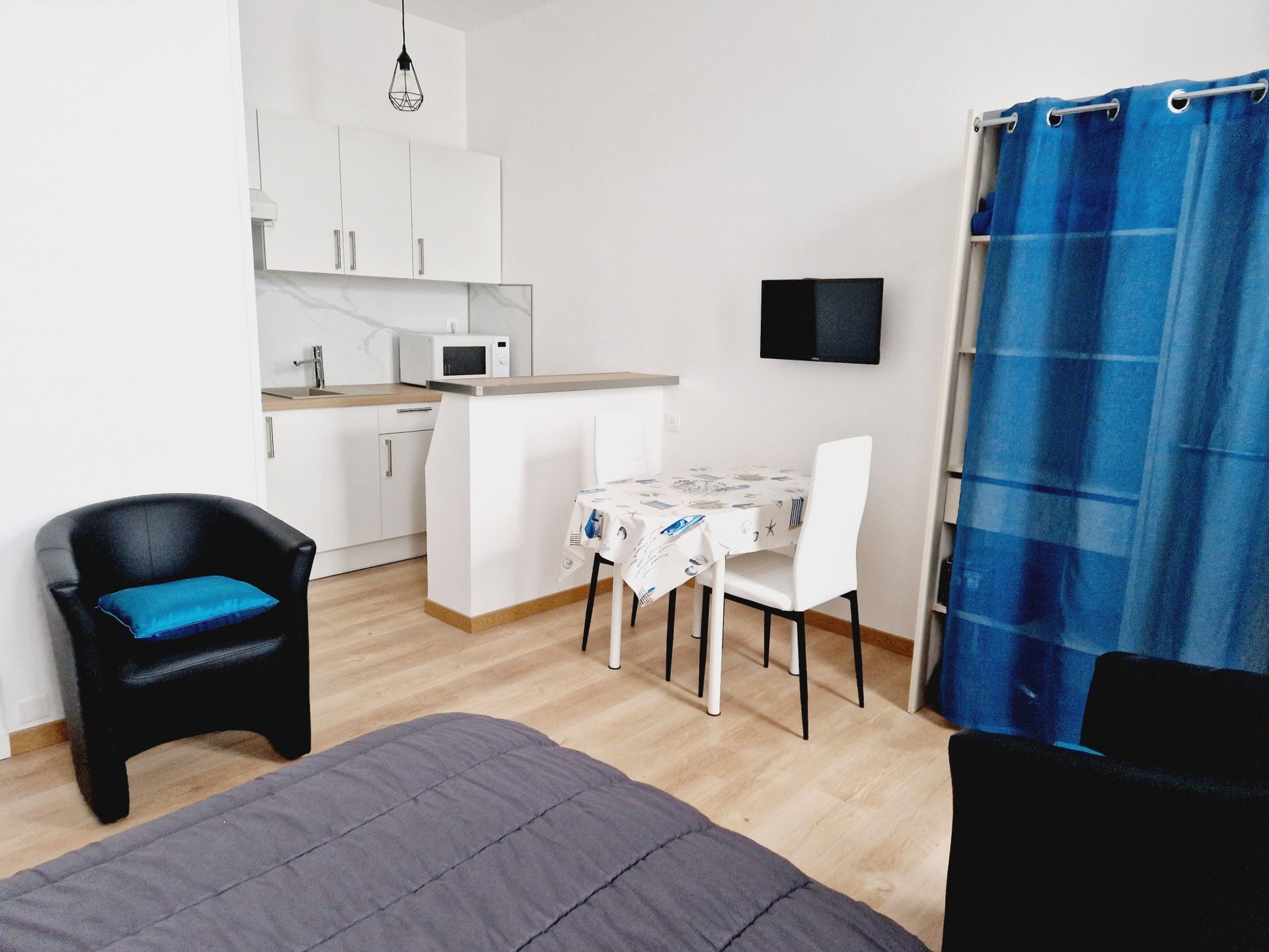 Studio meublé 2 **, 24m2 au 1er étage côté cour. Cuisine équipée. Séjour/chambre : 1 lit 140, TV. Salle de bain/WC, machine à laver. Chauffage électrique, parking sur la voie publique. Chèques vacances acceptés. Charges (EDF, chauffage) comprises de mai à septembre (non comprises les autres mois)
