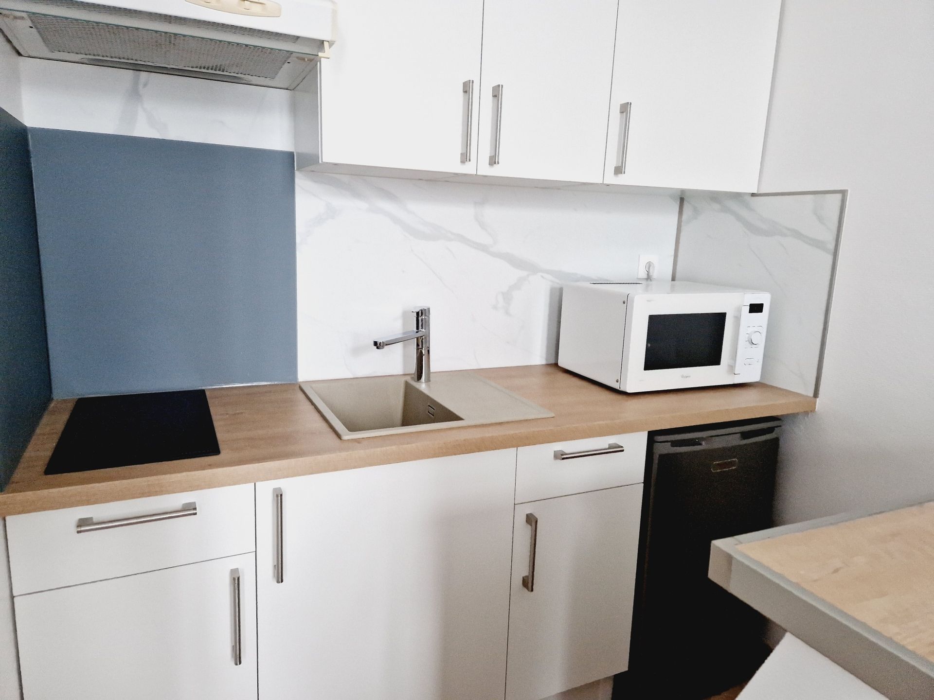 Coin cuisine aménagé avec 2 plaques électriques, réfrigérateur, évier 1 bac, hotte aspirante, rangements.