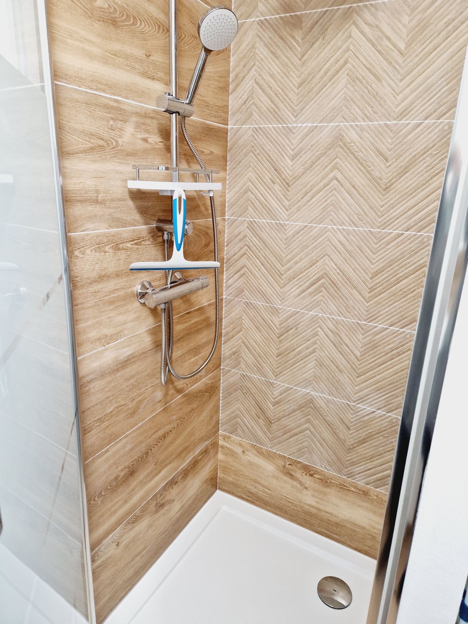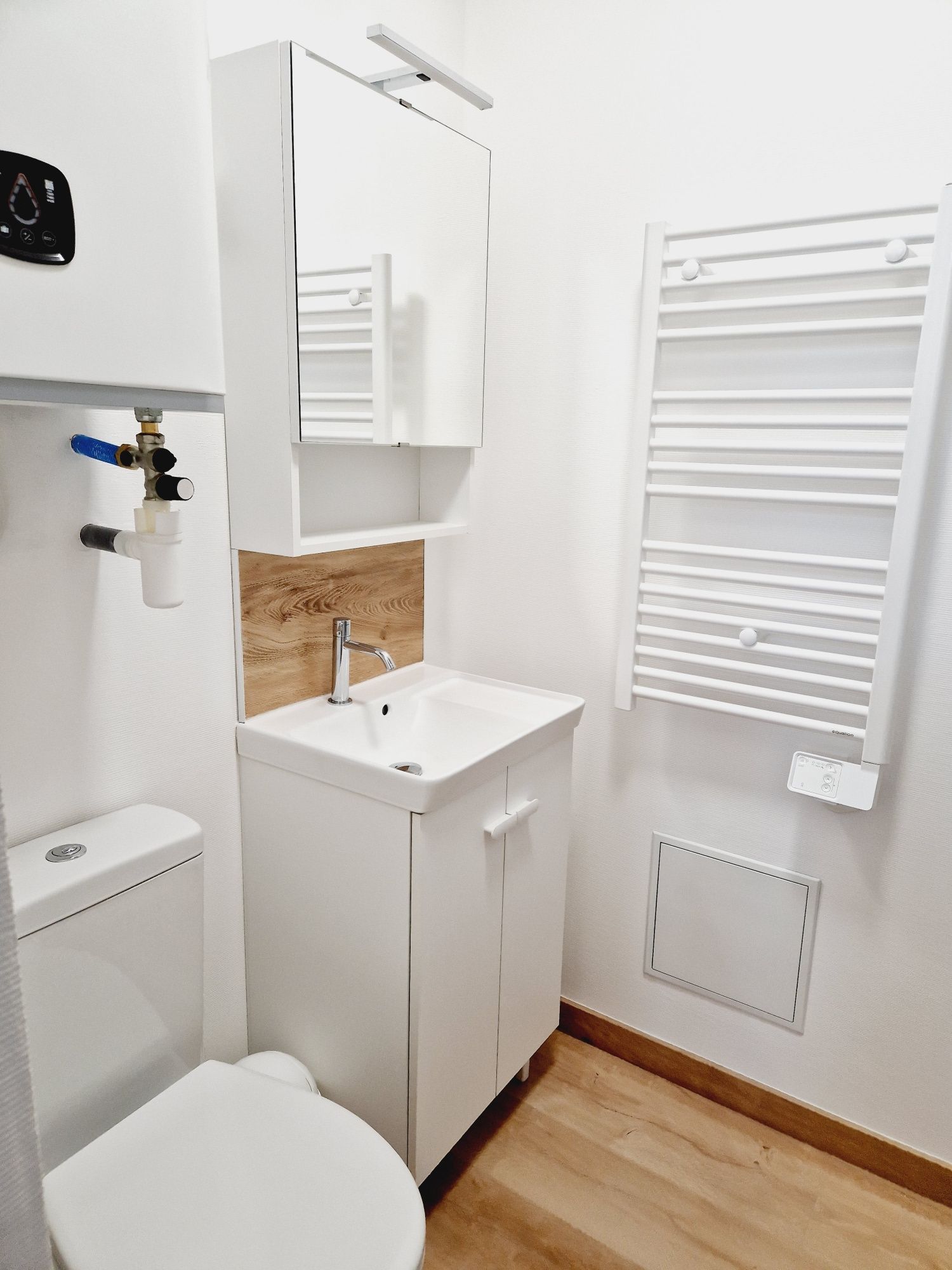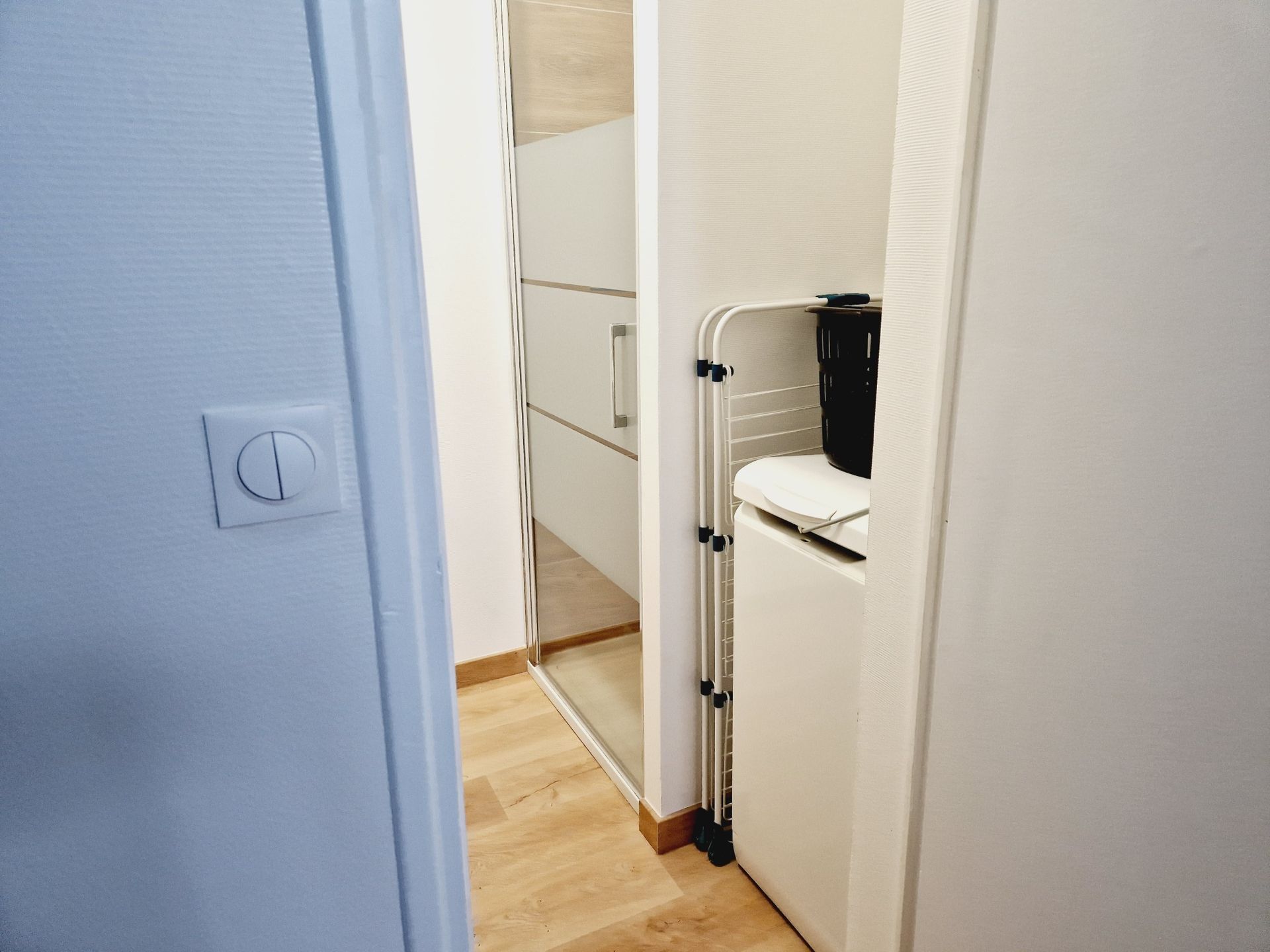 Salle d’eau aménagée avec meuble vasque, douche avec angle en verre Sécurit, WC, machine à laver, ballon d’eau chaude 100L.