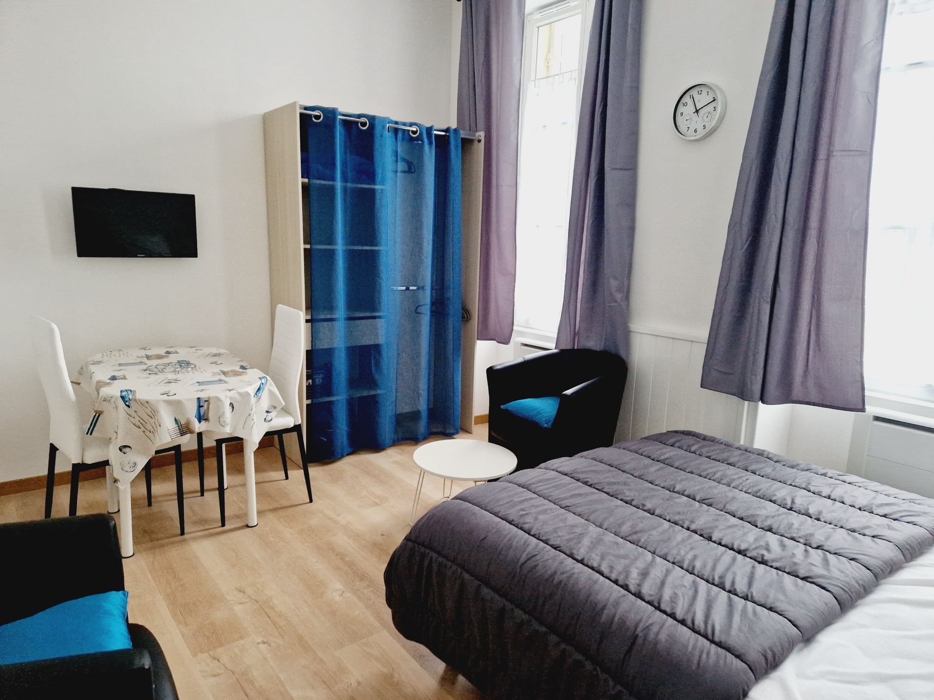1 Lit 140, 2 chevets , 1 penderie, 2 fauteuils cabriolet, 1 table basse, TV couleur (LED)
