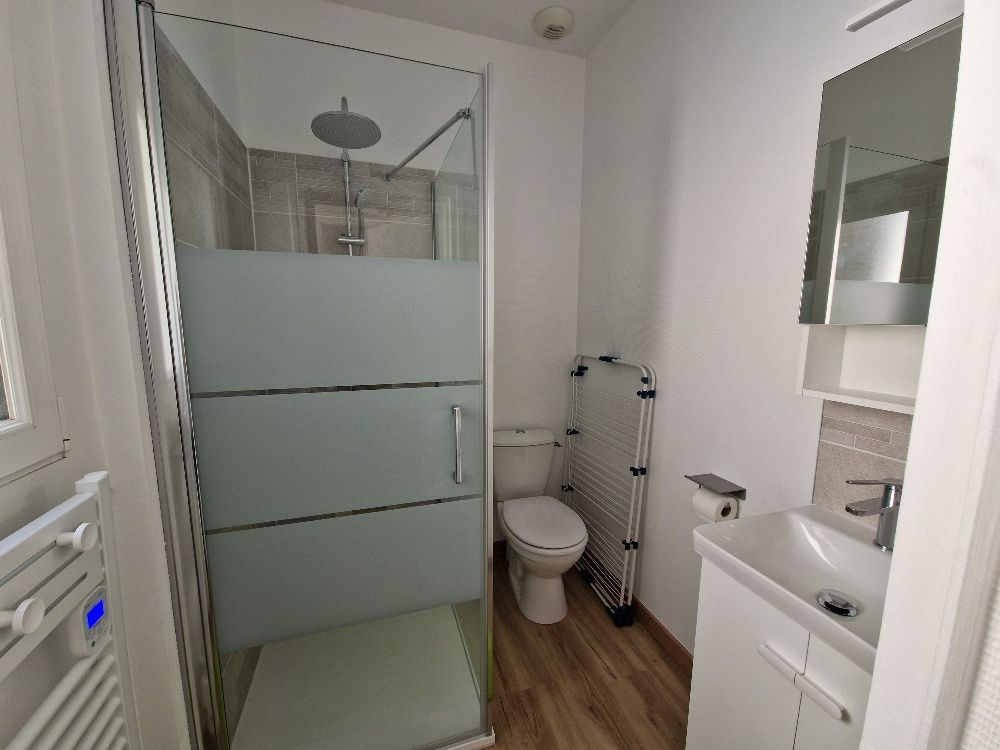 Salle d’eau aménagée avec lavabo, douche avec angle en verre Sécurit, rangement, WC, machine à laver, ballon d’eau chaude 100L.