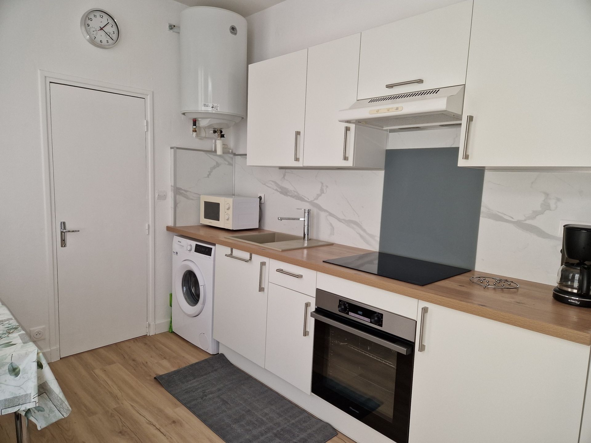 Il dispose d'une cuisine séparée équipée de divers rangements, 1 table, 3 chaises, 1 réfrigérateur, 1 cuisinière électrique vitrocéramique, 1 micro-ondes , 1 cafetière électrique, 1 batteur, 1 mixer,1 batterie casserole et vaisselle, 1 fer à repasser, tout le nécessaire pour passer un excellent séjour.