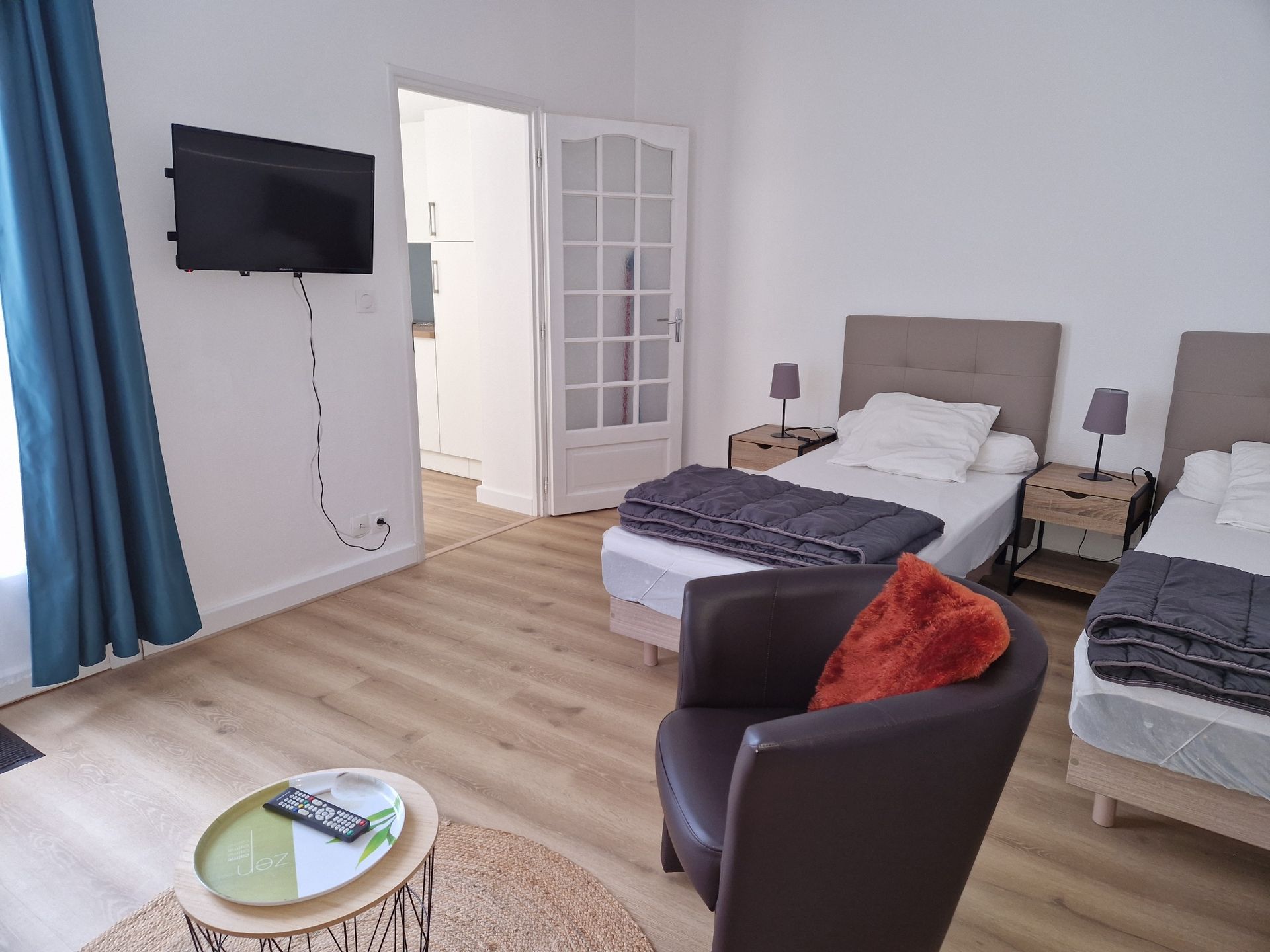 Salon / chambre: 2 lits 90 en pin avec chevets, 1 dressing, 2 fauteuils cabriolet, 1 table basse, TV couleur (LED)