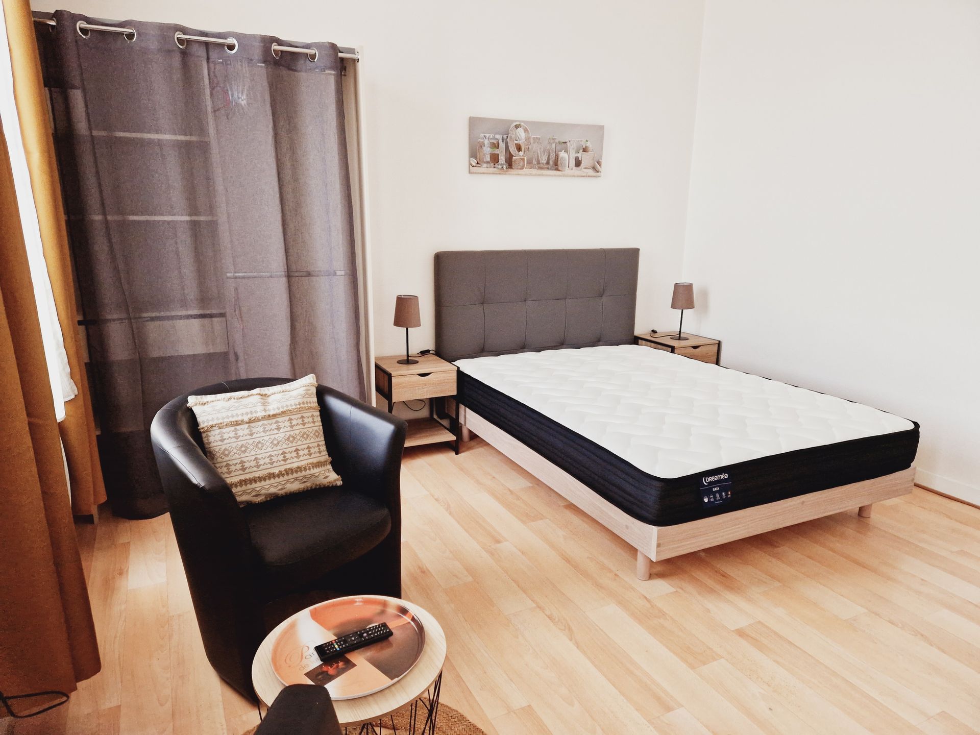 Salon / chambre: 1 Lit 140 en pin avec chevets et commode, 1 penderie, 2 fauteuils confort, 1 table basse, TV couleur (LED)