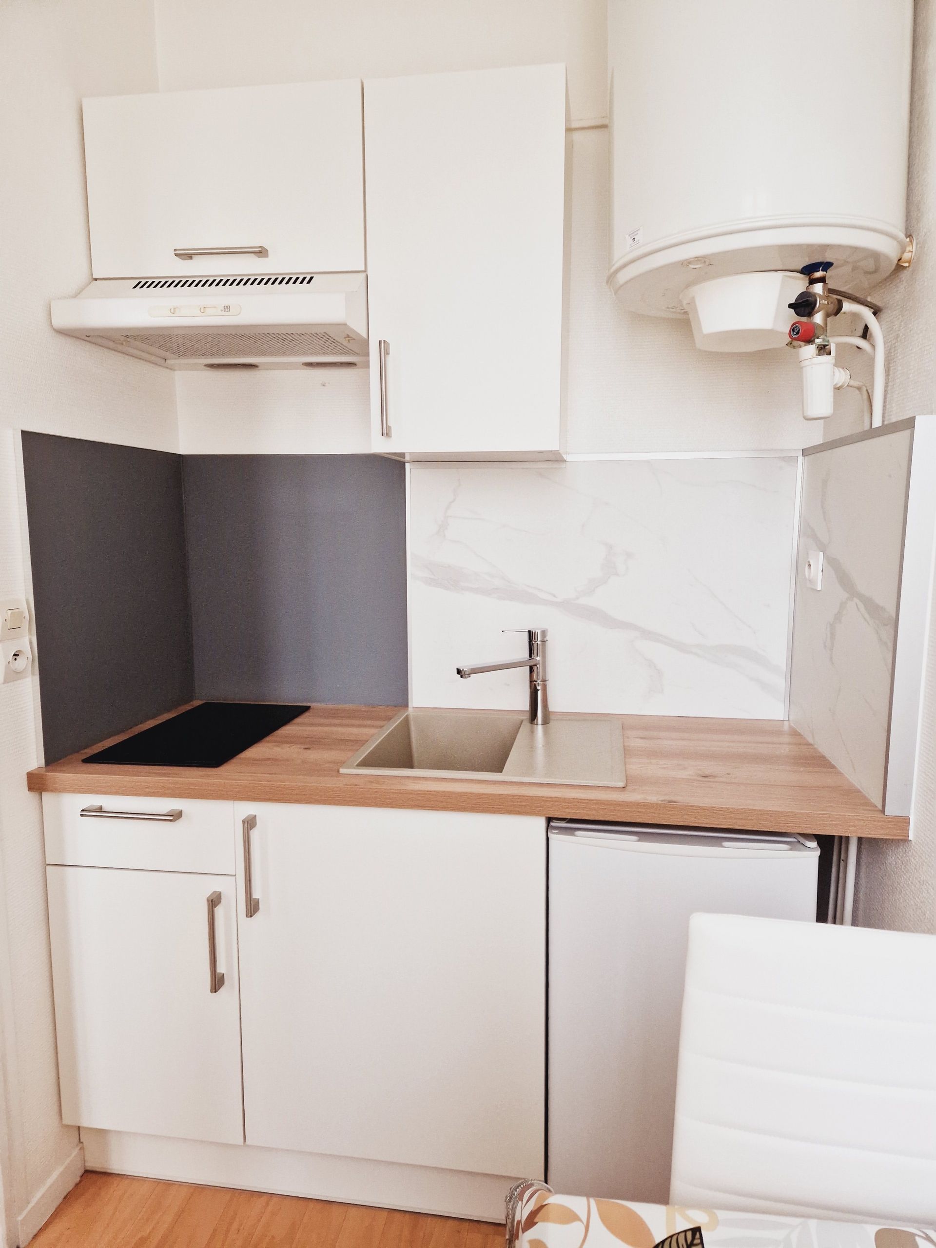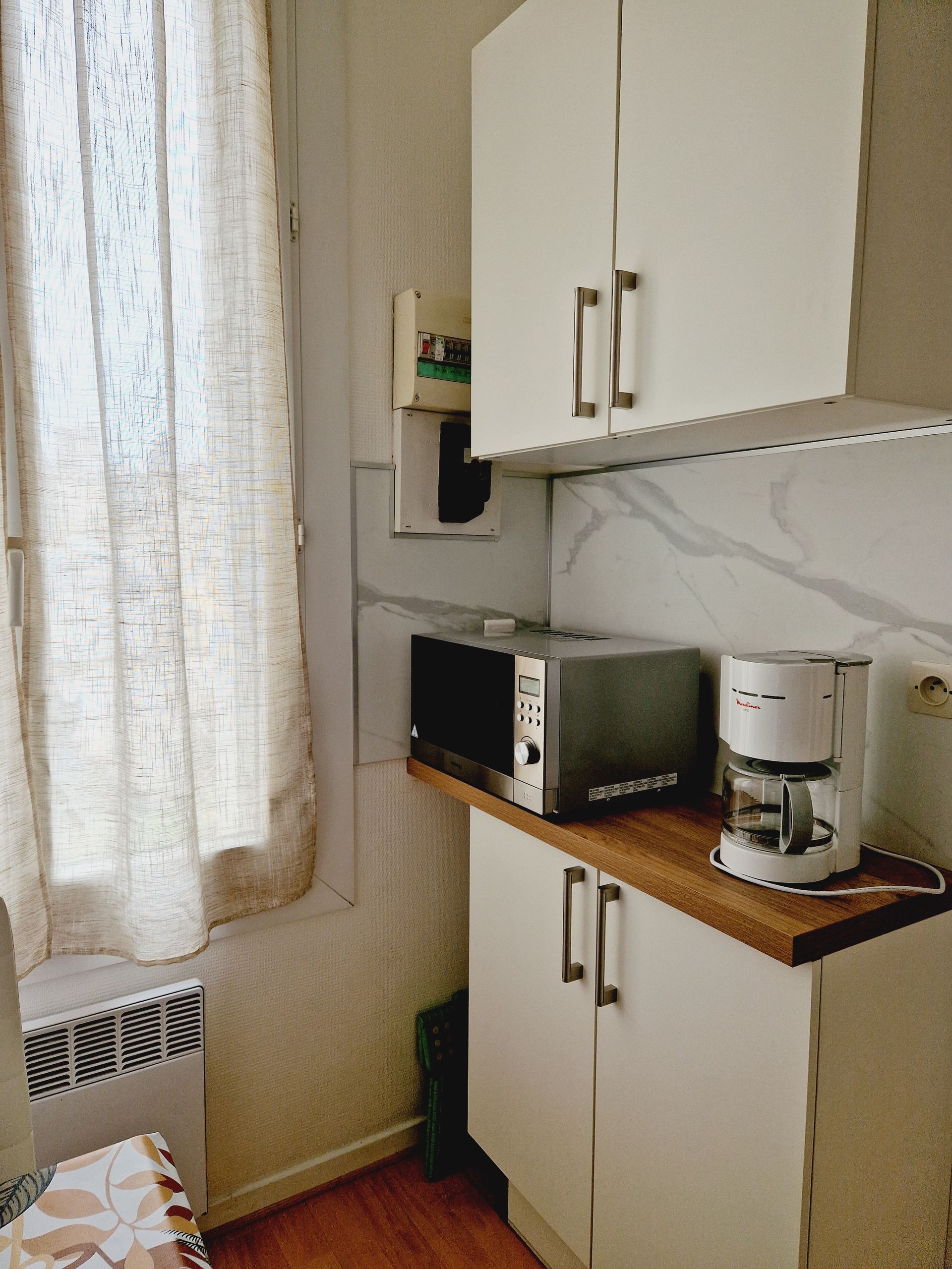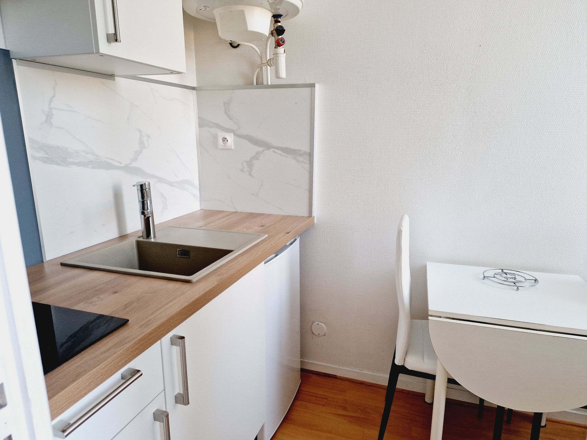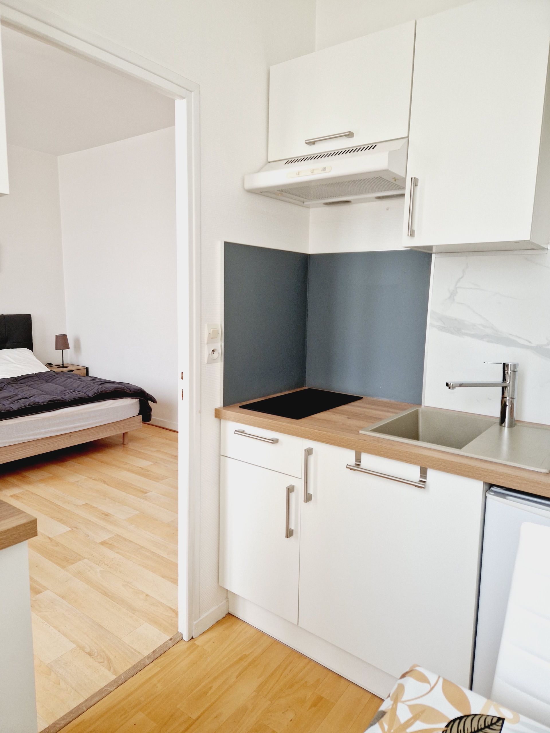 Il dispose d'une petite cuisine séparée équipée de divers rangements, 1 table et 2 chaises, 1 réfrigérateur, 1 plaque vitrocéramique, 1 micro-ondes multifonction, 1 cafetière électrique, 1 batteur, 1 mixer,1 batterie casserole et vaisselle, 1 fer à repasser et tout le nécessaire pour passer un excellent séjour.