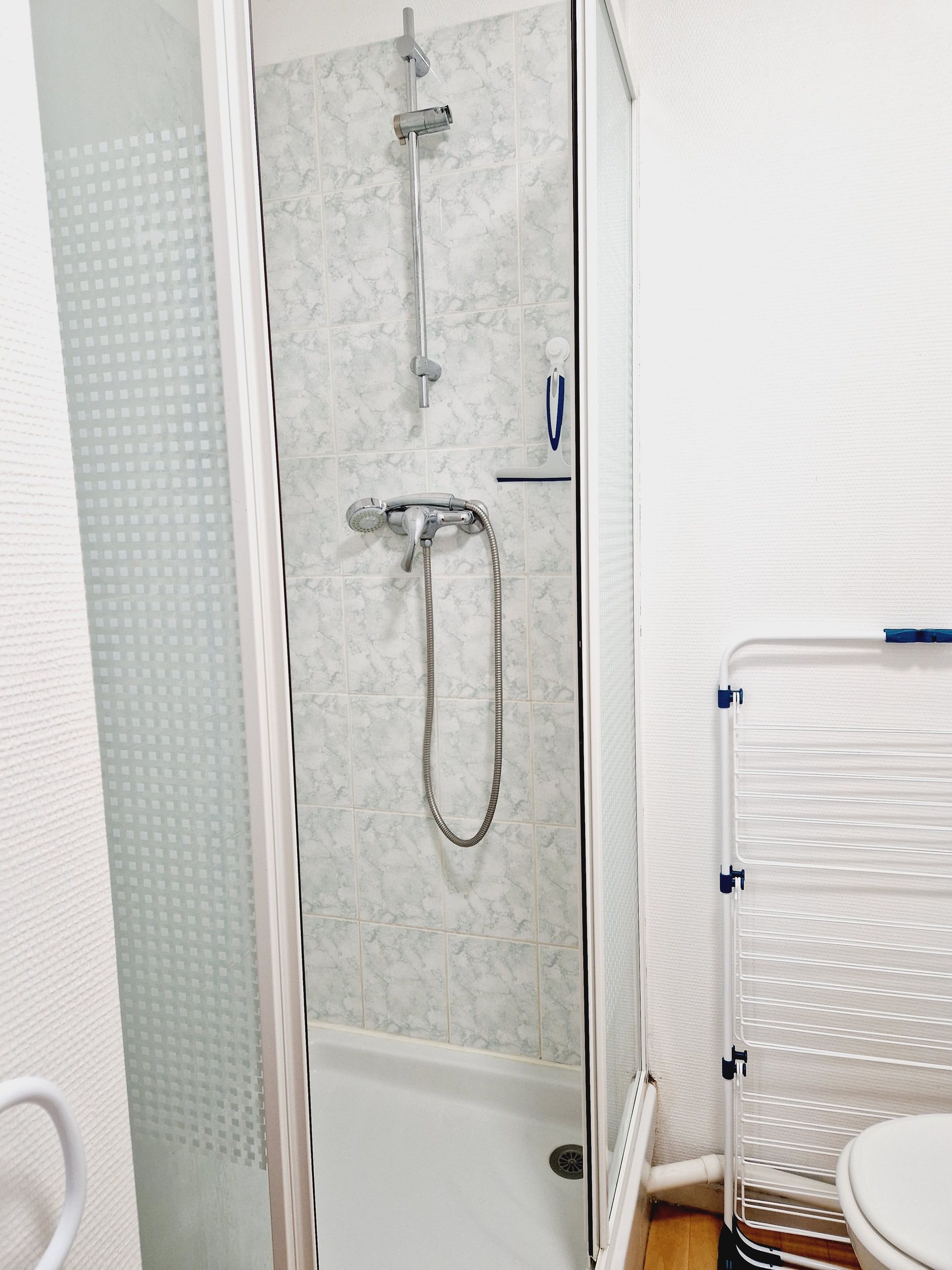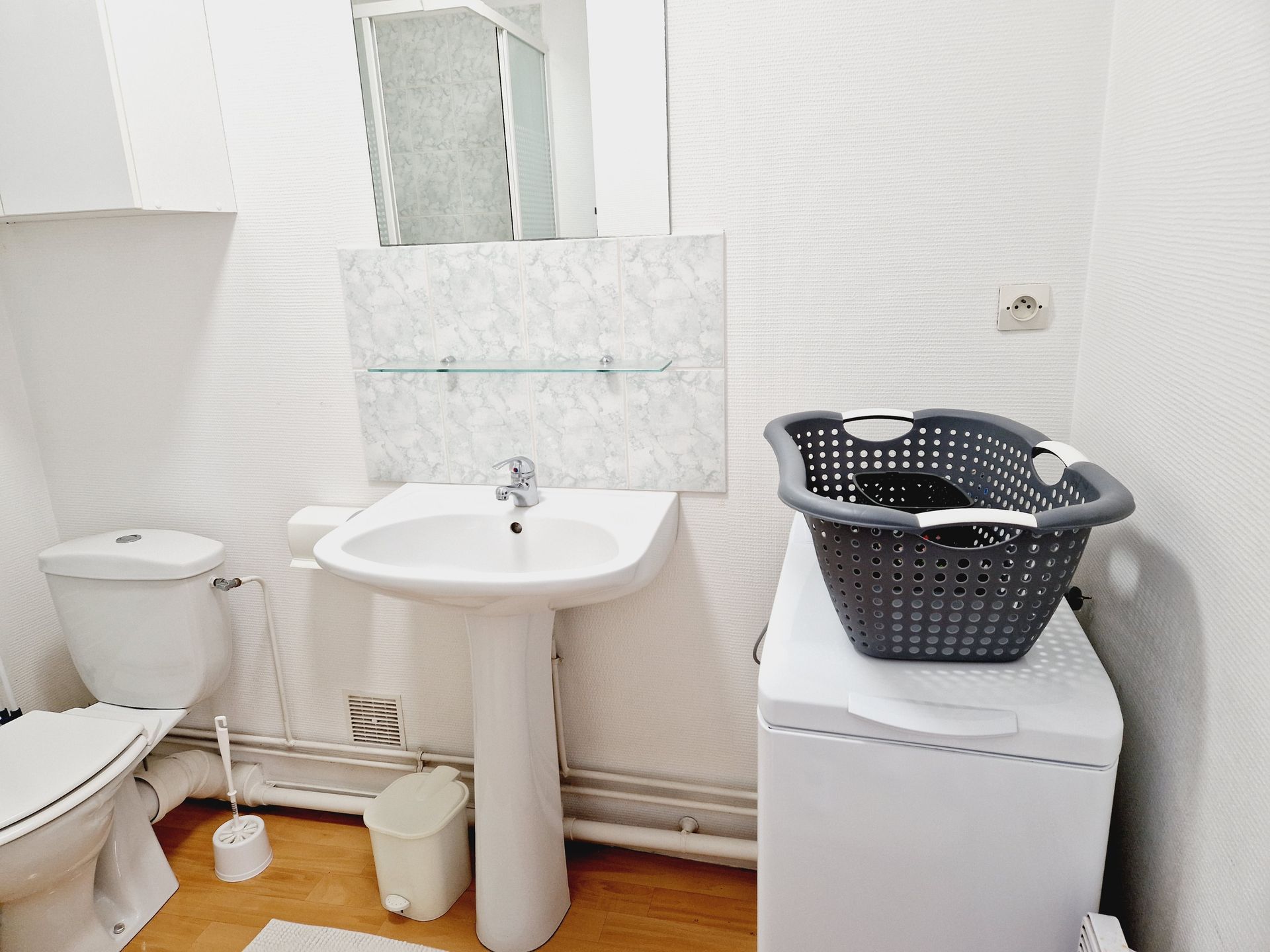 Salle d’eau aménagée avec lavabo, douche avec angle en verre sécurit, rangement, WC, machine à laver, ballon d’eau chaude 100L.
