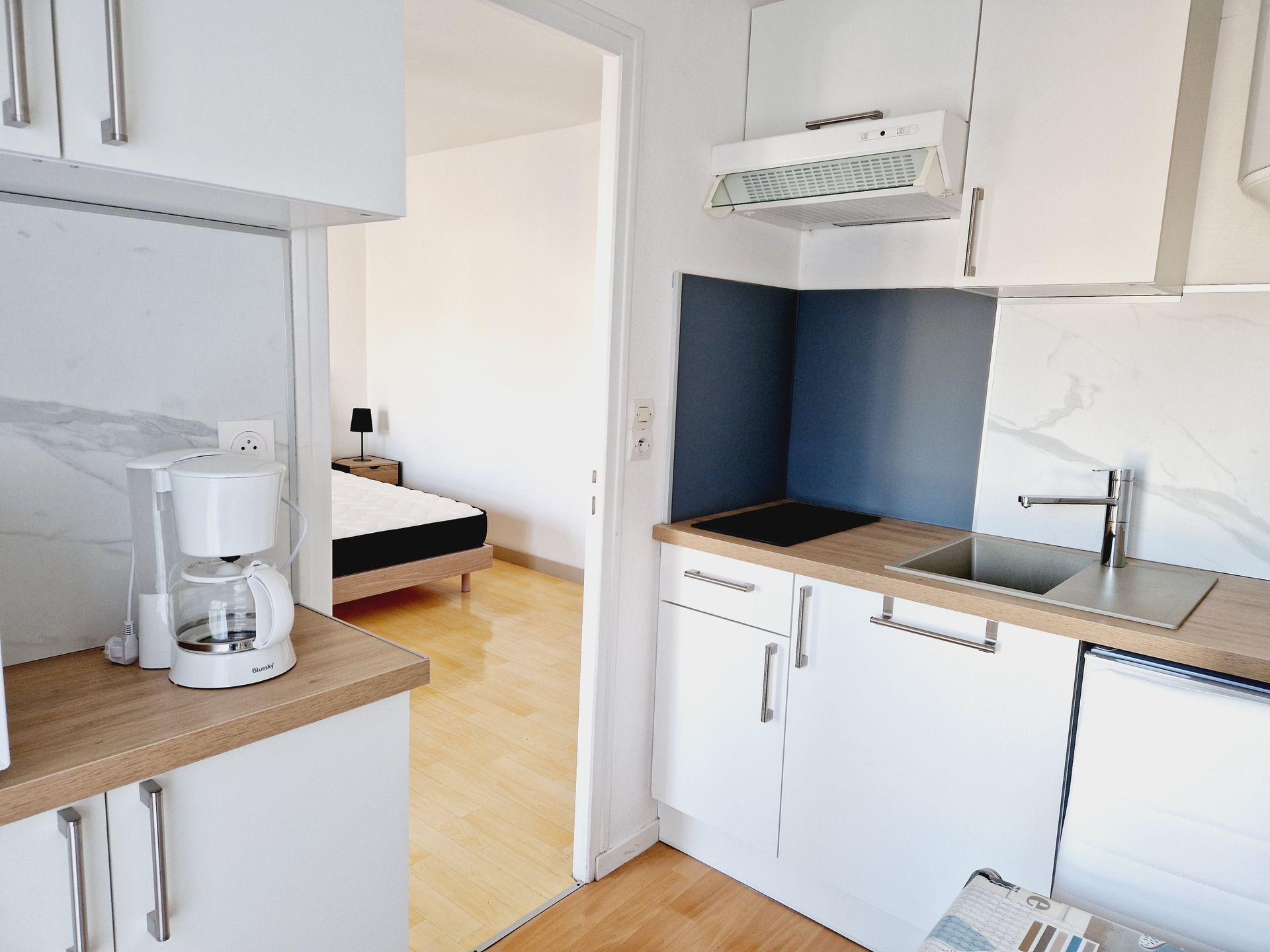Il dispose d'une petite cuisine séparée équipée de divers rangements, 1 table et 2 chaises, 1 réfrigérateur, 2 plaques électriques, 1 micro-ondes multifonction, 1 cafetière électrique, 1 batteur, 1 mixer,1 batterie casserole et vaisselle, 1 fer à repasser et tout le nécessaire pour passer un excellent séjour.