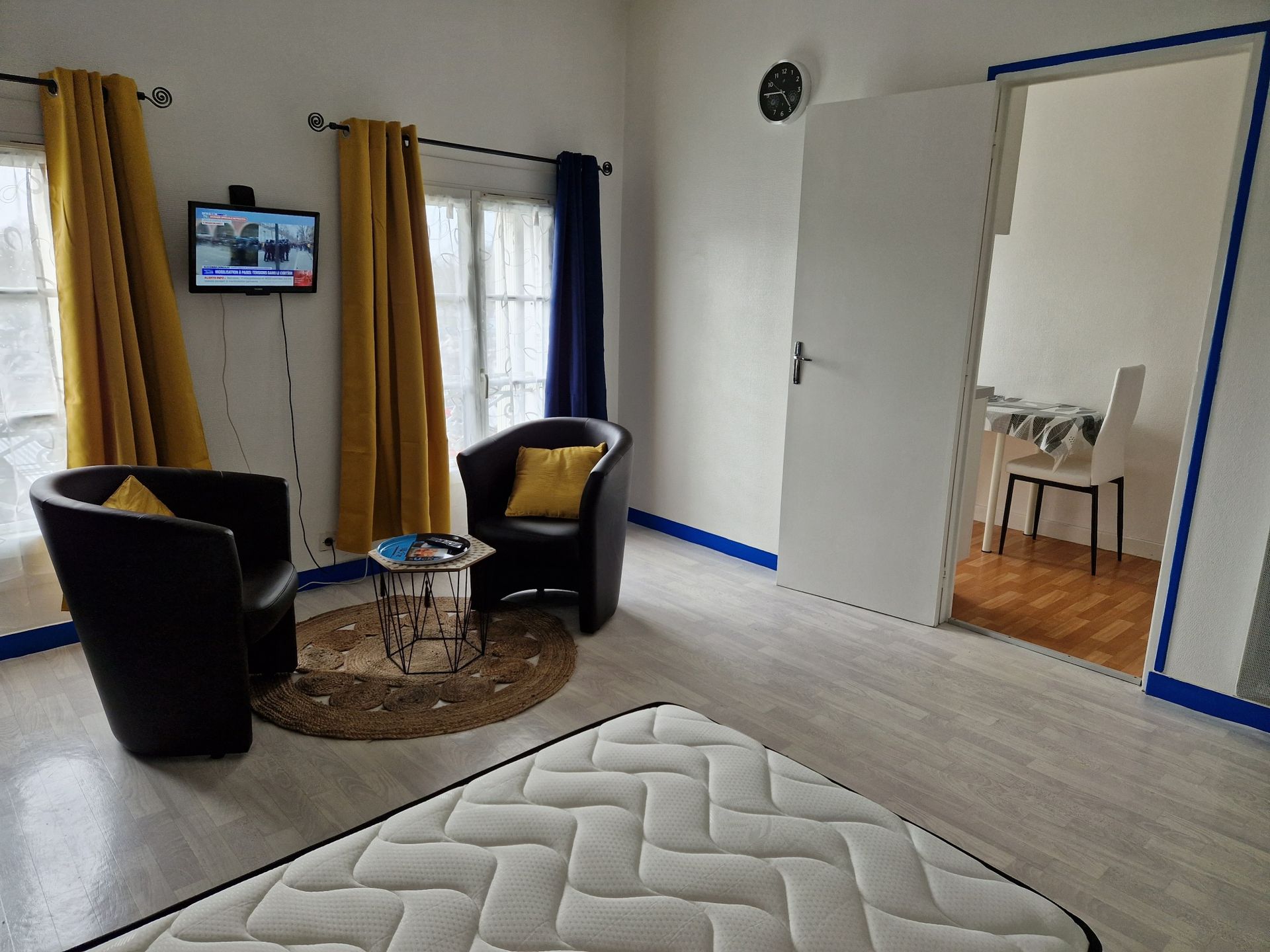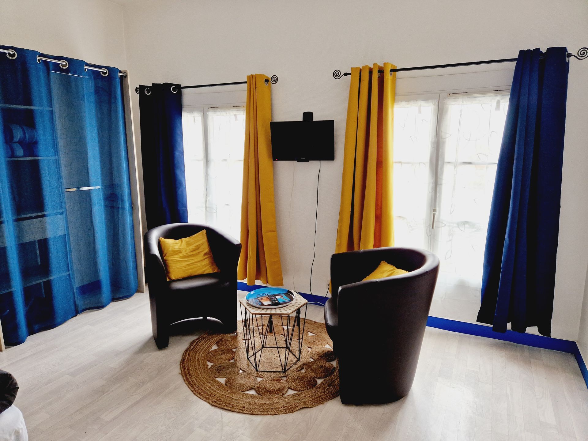Salon / chambre: 2 lits 90 en pin avec chevets , 1 penderie, 2 fauteuils confort, 1 table basse, TV couleur (LED)