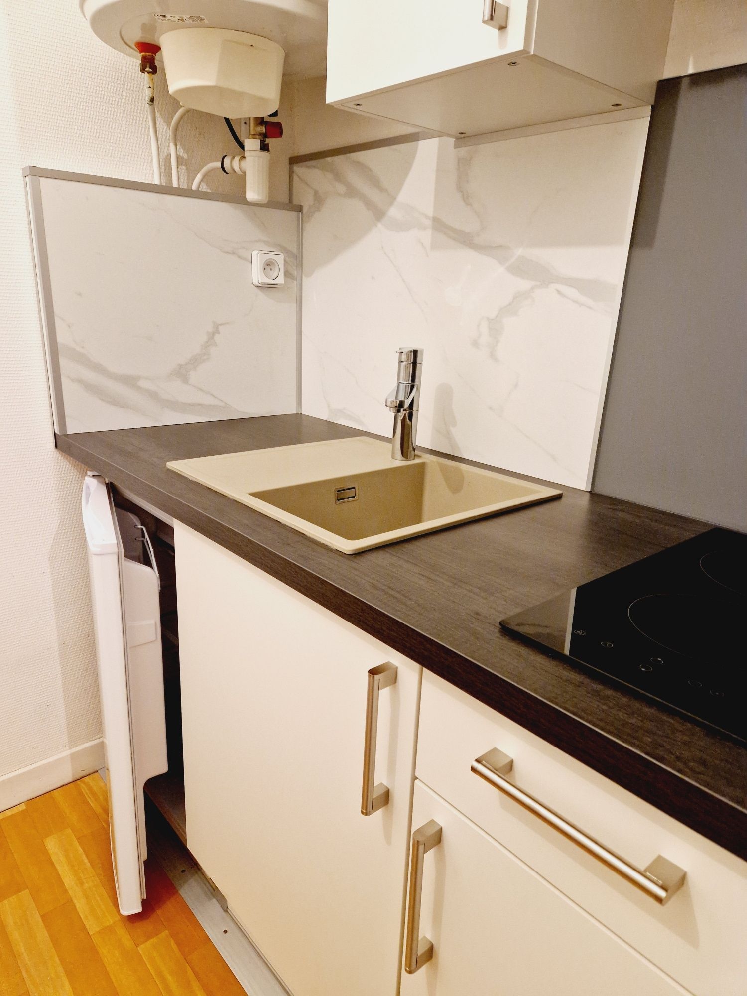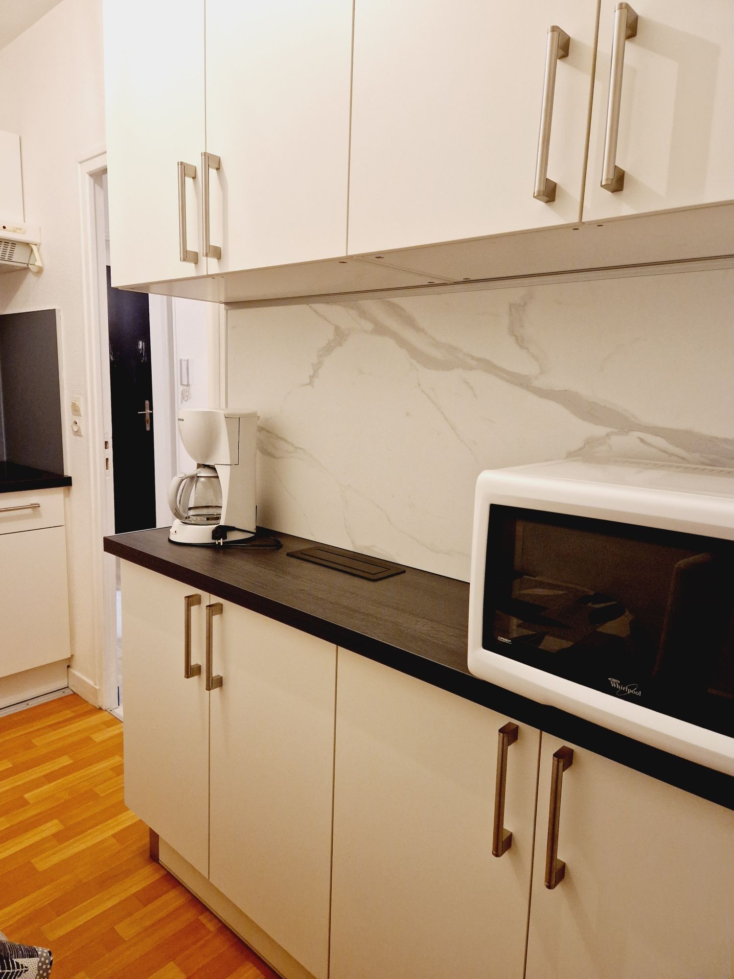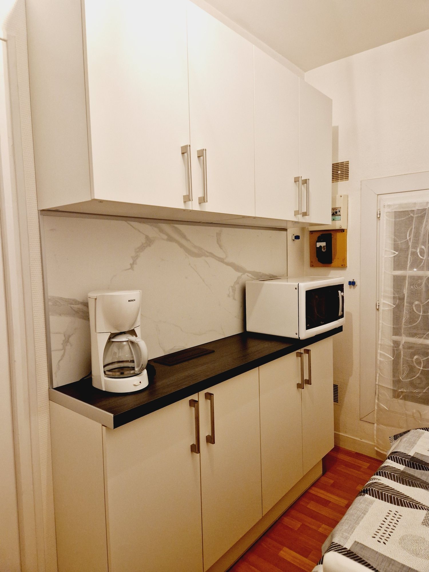 Il dispose d'une cuisine séparée équipée de divers rangements, 1 table et 2 chaises, 1 réfrigérateur, 2 plaques vitrocéramique, 1 micro-ondes multifonction, 1 cafetière électrique, 1 batteur, 1 mixer,1 batterie casserole et vaisselle, 1 fer à repasser et tout le nécessaire pour passer un excellent séjour.