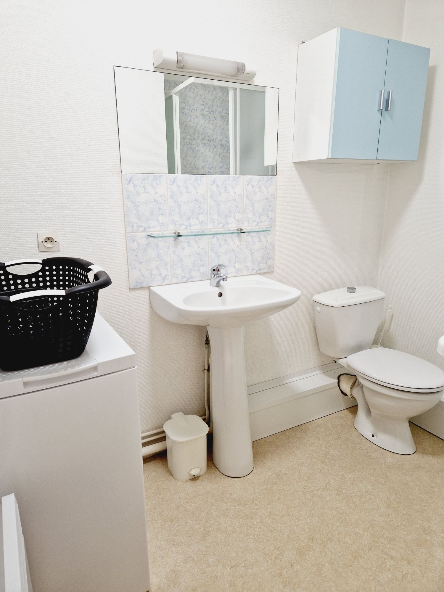 Salle d’eau aménagée avec lavabo, douche avec angle en verre sécurit, rangement, WC, machine à laver, ballon d’eau chaude 100L.